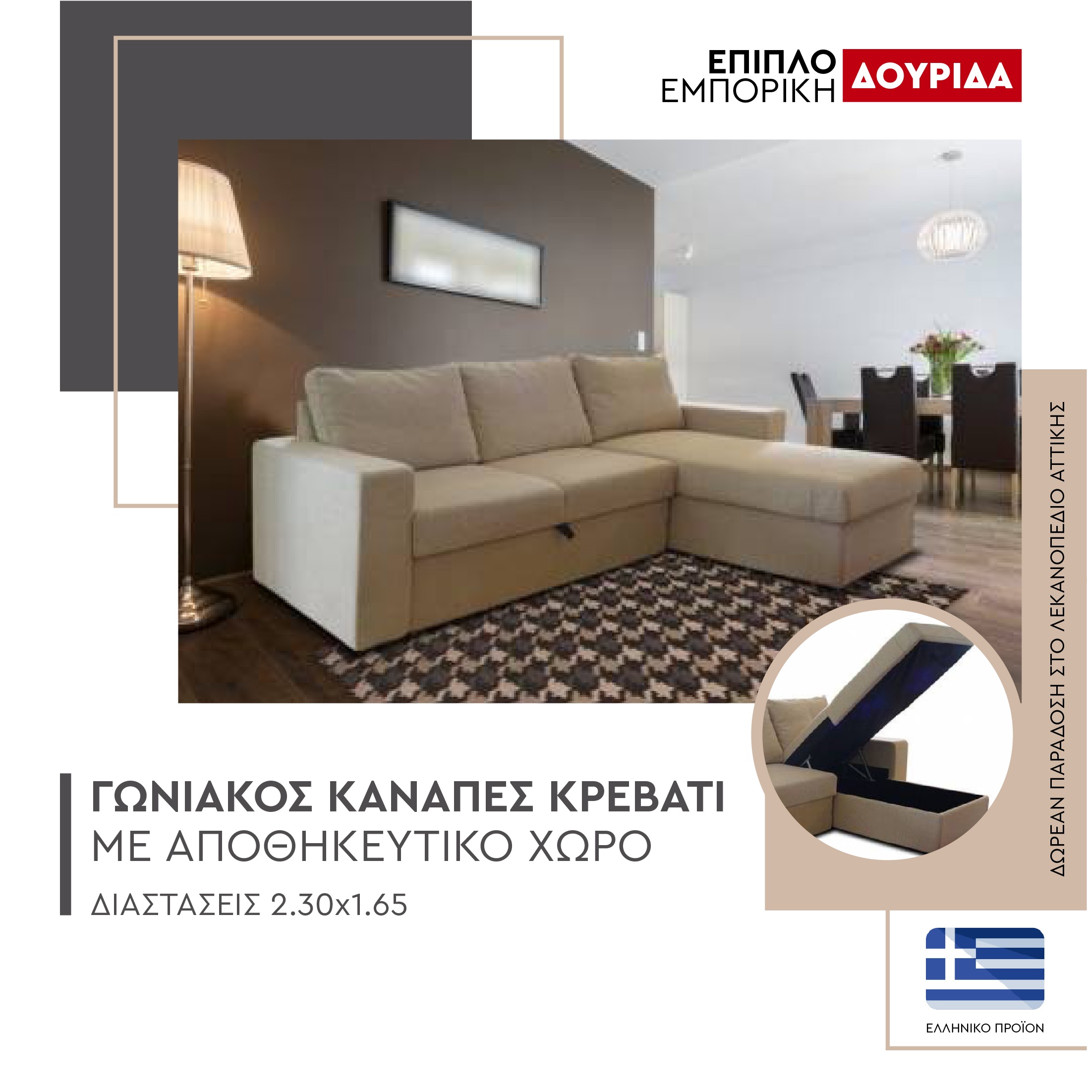 Γωνιακός καναπές – κρεβάτι με αποθηκευτικό χώρο. Ελληνικής κατασκευής από ξύλο οξιάς. Διαστάσεις: 230*165 και αλλαγή πλευρά γωνίας.